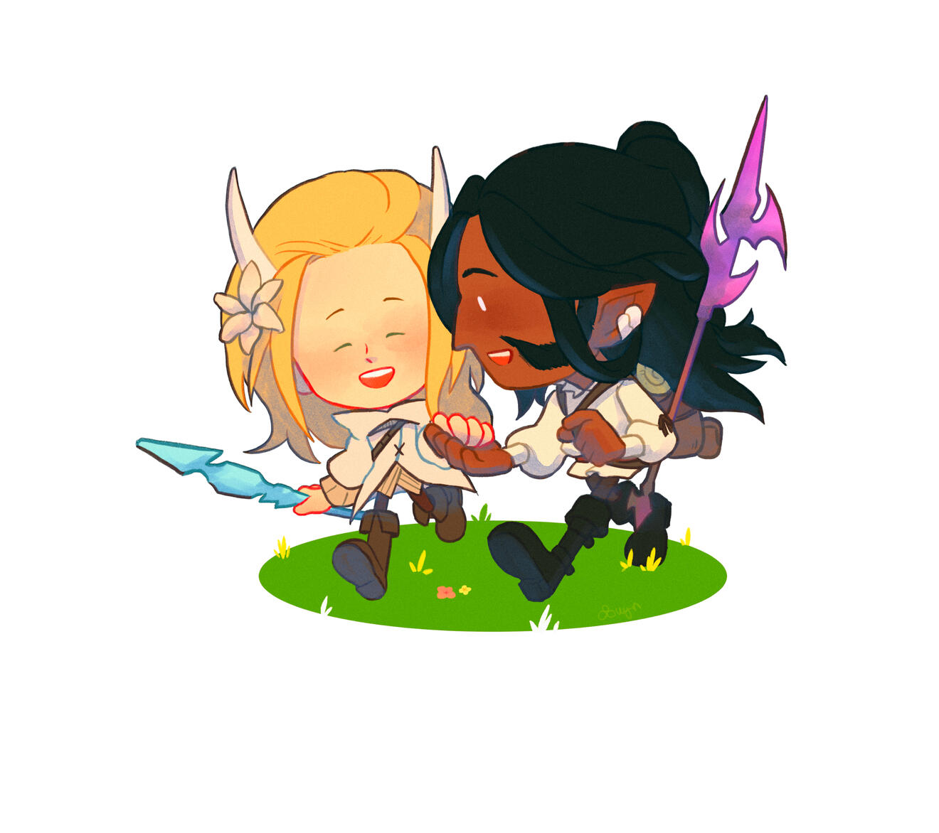Each additional character will cost the base price. If more than 3 characters are wanted, please note that on the request form and we can discuss pricing.Additional fee may occur if there's any additional weapon / effects / character complexity.